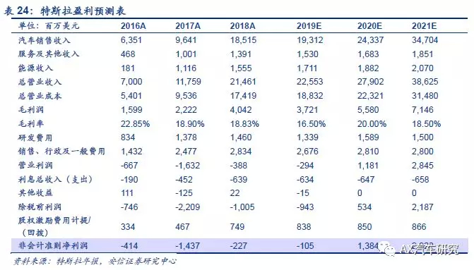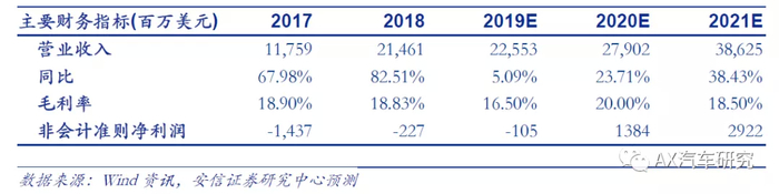 通过销量测算,我们预测特斯拉2019/2020/2021年汽车销售收入为193.12/243.37/347.04亿美元,给予服务及其他收入和能源收入10%的增速,对应非会计准则净利润分别为-1.05/ 13.84/29.22亿美元。