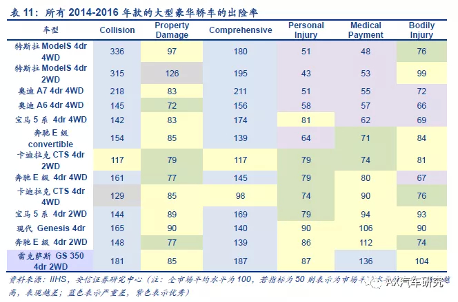 在车辆保护(PD和Collision)方面,Model S跟其他所有大型轿车一样,表现较差。而在对本车乘员的保护能力方面,Model S的己方乘员伤害出险率(PI和MP)是所有大型轿车中最低的。而在所有大型车辆当中,Model S的每辆车行驶里程也是最高的之一。对对方乘员的保护(BI)方面,Model S也属于优秀水平。