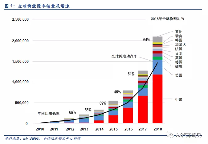 据国际能源署预测,2030年全球电动车销量将达到2300万辆,而2018年新能源车销量为201.8万辆,超过十倍的市场容量预示着未来新能源市场成长空间巨大。目前,全球新能源车尚处于起步阶段,2018年渗透率仅2.16%,2019年Q1也仅达到了4.9%,新能源车天花板足够高。