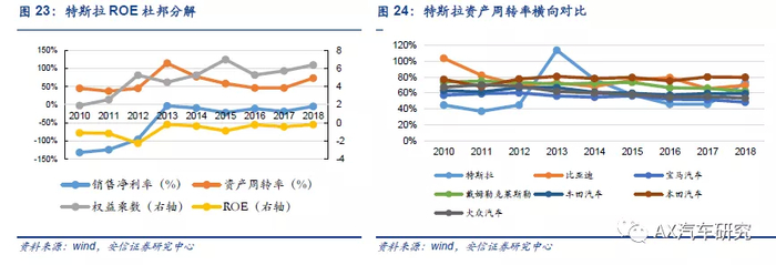 2018年ROE为-21%,同比增长51%。具体分析来看,1)销售净利率持续为负,自2013年后相对稳定,2018年为-5%,同比增长74%。2)特斯拉的ROE受资产周转率影响最大,车企的重资产属性导致车企的资产周转率几乎均低于1次,特斯拉也不例外,与同行相比公司的资产周转虽波动较大,但仍处于行业平均水平。3)权益乘数从2010年的1.89上涨至2018年的6.37,杠杆不断加大,核心还是在于当前这个阶段自我造血能力不足。