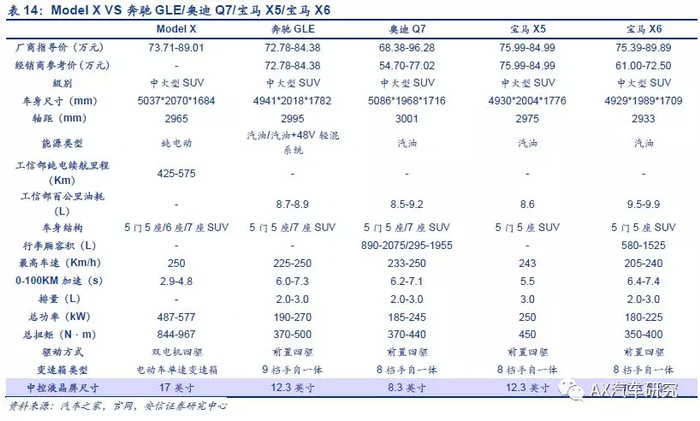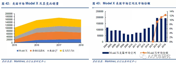 :从目前的销量数据来看,Model S在美国的销量远超其竞品奔驰CLS、奥迪A7和宝马6系,甚至自2015年超过三者之和。主要原因是Model S相比于传统豪华品牌的中大型车,在动力和操控性能、科技感、价值增值和造型设计上具有优势。而即使Model X具有动力和操控性能、科技感和造型设计方面的优势,但是其昂贵的售价使得其在美国的竞争能力远远低于奔驰GLE、奥迪Q7和宝马X5/X6。