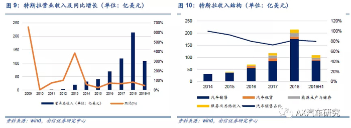 2018年,公司实现营收214.61亿美元,同比增长82.51%,2009-2018年年化复合增长率79.31%。2019年Q1和Q2公司分别实现营收45.41亿美元和63.50亿美元,同比增长33.23%和58.65%,其中汽车销售收入占比超过80%,2011-2018年年化复合增长率97.85%,始终维持高速增长。