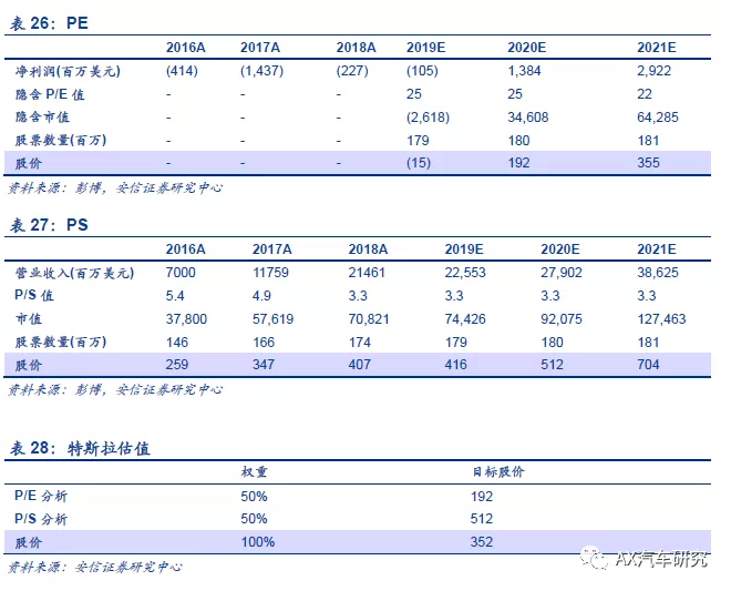 预测特斯拉2019-2021年汽车销售收入为193.12/243.37/347.04亿美元,给予服务及其他收入和能源收入10%的增速,对应非会计准则净利润分别为-1.05/13.84/29.22亿美元。给予3.3倍PS估值和25倍PE估值,目标股价为352美元。