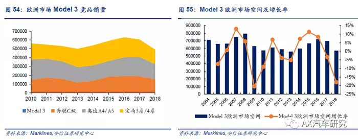 :以同价格带同类别车的销量作为Model 3在欧洲市场对应的市场空间,Model 3市场空间在70万辆左右。2016-2018年,Model 3对应的欧洲市场空间持续下滑。