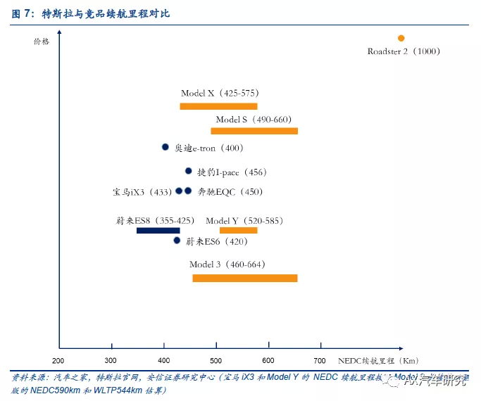 相比于磷酸铁锂(LFP)和以镍钴锰(NCM)为正极材料的锂电池,公司使用的以镍钴铝(NCA)为正极材料的圆柱形锂电池能量密度更高,但是稳定性和安全性较差。特斯拉通过强大的电池管理系统和热管理系统,实现了对电池及时准确的有效管理,将电池之间的温差控制在±2度、电压控制在2-3毫伏,解决了NCA圆柱形电池的安全性问题。NCA超高的能量密度帮助特斯拉续航里程遥遥领先竞争对手。