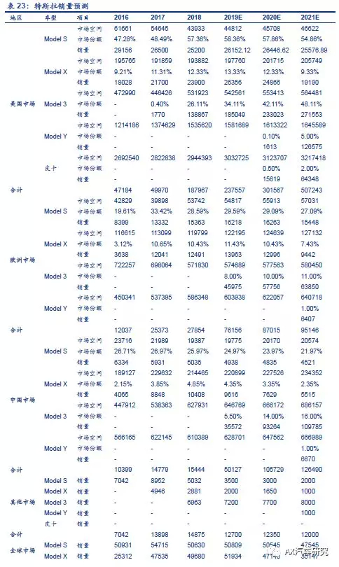 :Model S/X优势:动力和操控性能,科技体验和价值增值。Model 3/Y优势:科技体验、动力性能和性价比。Model P优势:综合性能、科技感和性价比。:通过测算市场空间和市场份额,分市场分车型预测特斯拉销量,预测2019-2021年销量分别为37.65/50.67/74.09万辆,同比增长52.98%/34.56%/46.23%。