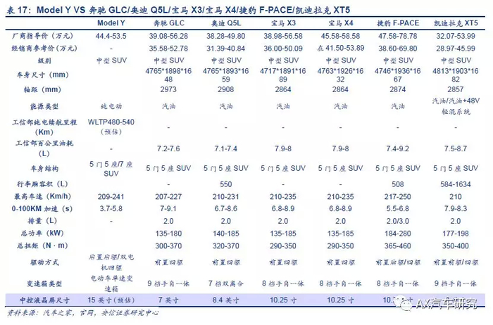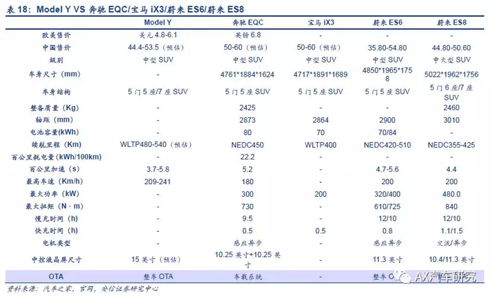 1)与同级别的SUV蔚来ES6相比,Model Y售价高5-8万,随着Model Y的国产化,售价差距或将缩小。Model Y的最高车速和续航里程略占优势,其Autopilot自动驾驶系统和整车OTA空中升级与ES6的NIO Pilot和整车OTA空中升级相比,优势并不明显。但是,Model Y的品牌力远超蔚来ES6。2)Model Y与蔚来ES8的售价相近,但定位中大型SUV的ES8车身尺寸更大。Model Y的最高车速和续航里程远远领先于ES8,但是在科技配置方面双方持平。