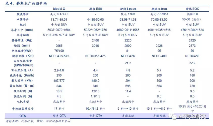 Model X和蔚来ES8同为支持整车OTA升级的中大型SUV,轴距、百公里加速、最大功率、最大扭矩、慢充时间等参数相近,蔚来ES8续航里程和最高车速较弱,Model X快充时间较弱,但Model X的售价高过ES8 60%左右。与捷豹I-pace、奥迪e-tron和奔驰EQC奔驰等传统豪华车企生产的纯电动相比,双方的轴距、续航里程、电池容量等参数相近,但Model X具备更优的车身尺寸、百公里加速、最高车速、最大功率、最大扭矩,支持整车OTA ,而捷豹I-pace、奥迪e-tron和奔驰EQC奔驰的充电时间更占优势,Model X的售价高出7%-25%。总体来说,Model X的售价超出其他电动车竞品7.23%-65.91%,显示了特斯拉较强的品牌溢价,与行业领导者的地位是相称的。