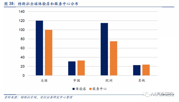 传统车企的销售通常是通过4S店代理销售,客户最终拿到车要经过经销商的中间环节。而特斯拉建立了“实体店体验+官网预订”模式为消费者提供体验、销售、交付和售后一条龙的服务。截至2018年底,公司在全球范围内已经布局了378家体验店与服务中心,仅中国市场这一数量便达到了64家。