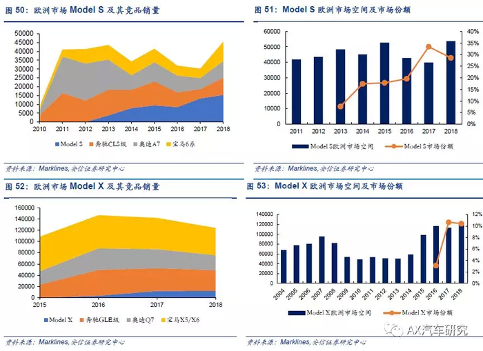 :从目前的销量数据来看,Model S在欧洲的销量远超其竞品奔驰CLS、奥迪A7和宝马6系,达到三者销量之和的一半,但是仍不及其在美国的势头。主要原因是Model S在美国具备本土优势,且特斯拉的在美国的体验店、服务中心和充电网络更密集。而Model X昂贵的售价使得其在欧洲的竞争能力与美国一样,远远低于奔驰GLE、奥迪Q7和宝马X5/X6。