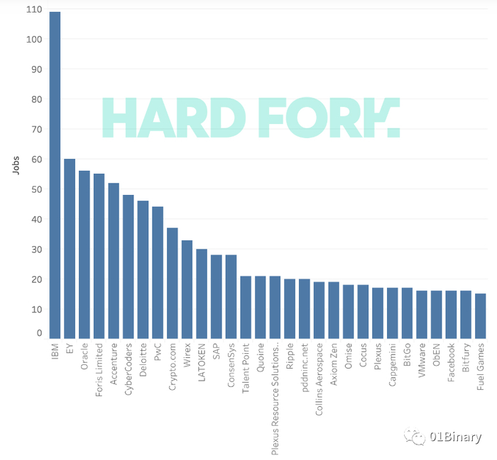 在区块链人力资源上,IBM同样投入了巨大精力。2018年,IBM曾招募大约1600 名员工探索区块链技术项目。根据TNM的最新统计数据,IBM的区块链职位需求接近110个,远远领先于其他竞争对手。