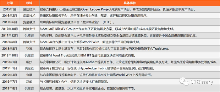 IBM是最早布局企业级区块链的科技巨头,2014年,IBM便开始对区块链进行探索,但当时并没有自行建造,而是借助以太坊。2015年,IBM成为超级账本(Hyperledger Fabric)的初始成员企业。截至目前,IBM的区块链布局已经涉及底层技术、贸易融资、跨境支付、供应链、物流、医疗等不同领域。