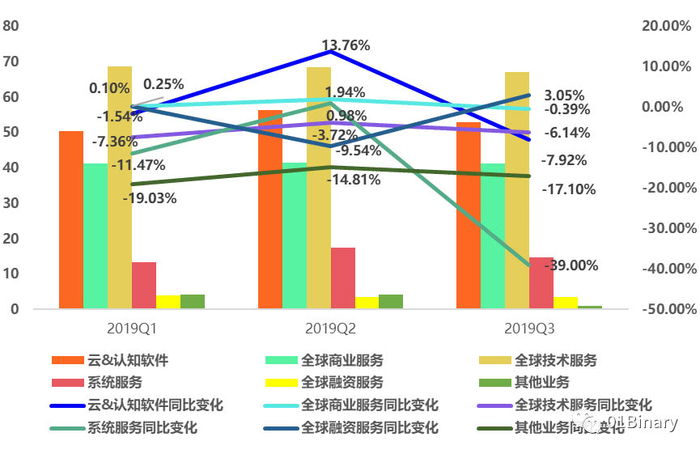 但从各类业务收入变动情况看,2019年第三季度,IBM的业绩下滑几乎覆盖了全部门,而不仅仅是全球技术服务,其中,云&认知软件同比下降7.92%;全球商业服务同比下滑0.39%;全球技术服务同比下降6.14%;系统服务同比下降达39%;其他业务同比下降17.10%。
