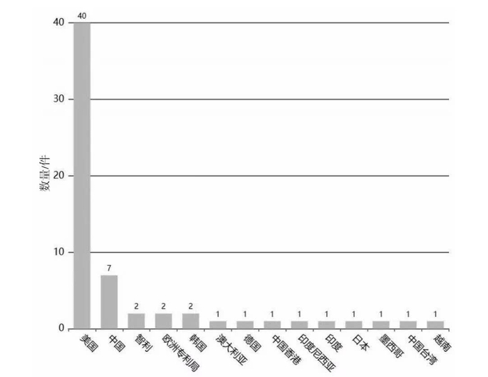 创立于1985年的SunPower拥有超2 000件光伏技术专利,其研发的叠瓦技术是目前市场上最具代表性的先进新技术之一。据了解,目前,SunPower叠瓦组件转化效率超过19%,比常规PERC单晶组件发电量高7%以上,25年内发电量可高17%,还可节省10%的直流系统成本。且SunPower与国内的中国东方电气集团有限公司、天津中环半导体股份有限公司共同出资成立东方电气东方环晟,主要利用叠瓦组件技术从事太阳能电池片的研发、制造、销售与相关服务,SunPower叠瓦组件专利的具体分布区域如图2所示。