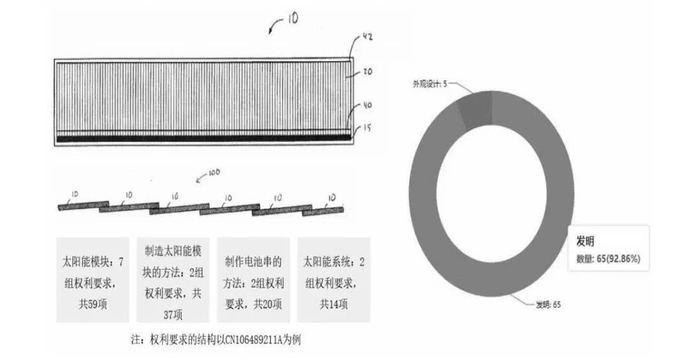 以其在中国所申请的CN1064-89211A为例,其太阳能模块通过7组共59项的权利要求予以保护、制造太阳能模块的方法涉及2组权利要求共37项、利用太阳能模块制作太阳能电池串的方法涉及2组权利要求共20项、太阳能系统涉及2组权利要求共14项。可见,SunPower从外观设计和发明专利两方面对叠瓦组件的外形、结构及其制造系统和方法予以全面的保护(见图3)。