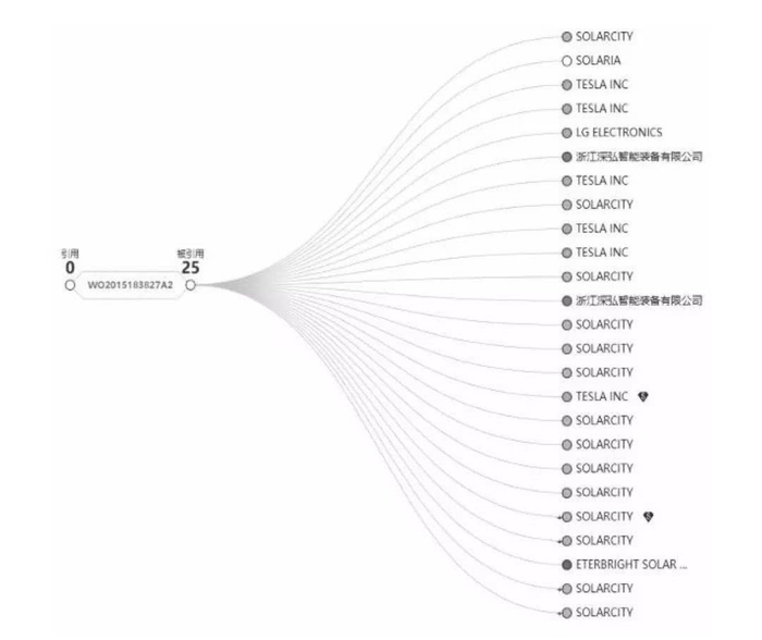考虑到该专利于2018年5月29日才公开,被引用信息尚少,从其简单同族WO2015183827A2的引用信息分析可知,该专利于2015年12月3日公开后,在3年的时间之内被引用24次,其中,美国最大的太阳能发电公司SOLARCITY引用该专利的频次高达14次,并在此基础上,产生了价值超过$5 000的专利1件。