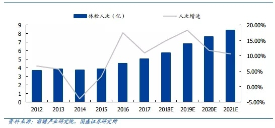 从体检行业整体来看,根据前瞻产业研究院的预期,随着全国健康保健意识的增强,以及对消费升级所带来的产业机会的预期,预计2018年后全国体检人次将继续保持高速增长,至 2021 年全国健康体检数量可实现 8.4 亿人次。