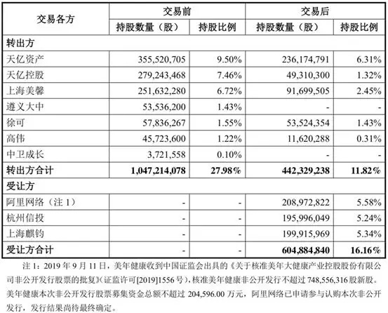 10月27日晚间,美年大健康产业控股股份有限公司(以下简称“ 美年健康 ”)发布公告,称公司控股股东上海天亿资产,与一致行动人以及其他股东——天亿控股、上海美馨拟向阿里网络、杭州信投、上海麒钧分别转让美年健康5.58%、5.24%、5.34%股份,转让价格均为12.01元/股,总价为人民币25.1亿元。