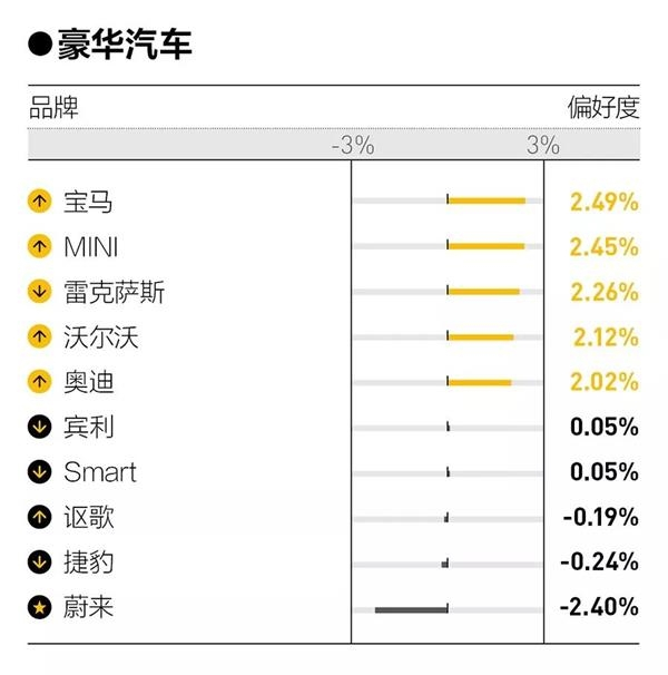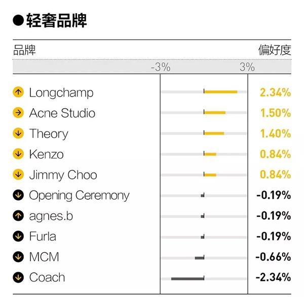 品牌名称前圆圈中的箭头反映了该品牌相交去年的排名变化;