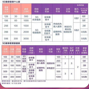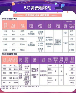 中国移动5G资费套餐分为个人版和家庭版2个版本,起售价128元起步,最高869元。