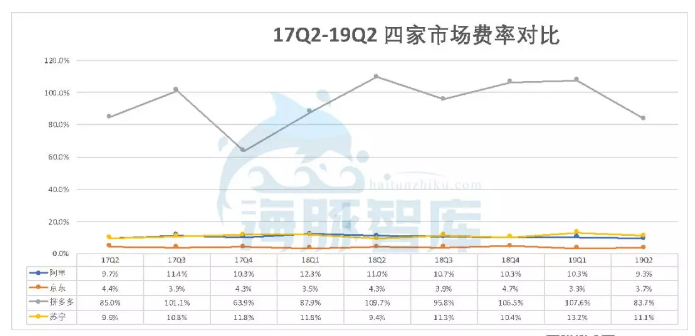 兵马未动,粮草先行。营销费用就像粮草一样,增加市占率,扩充商家和客户都需要花钱,在之前阻挠拼多多前进的一大因素就是粮草了,好在拼多多通过融资,上市、发债解决了问题,几家里面拼多多最激进,市场费用遥遥领先,效果也显著,盈利压力也相对来说最大。