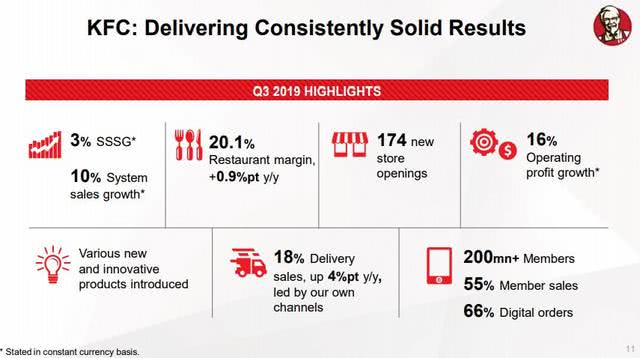 截至第三季度,肯德基的外卖销售占比为18%,同比增长4%,由自有外卖渠道领增