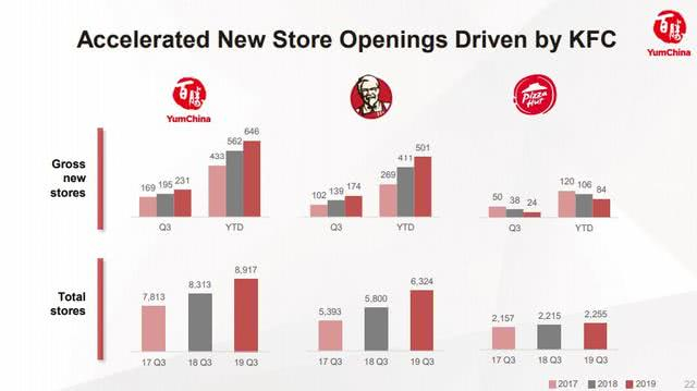 在面对分析师的会议上,百胜中国首席执行官屈翠容(Joey Wat)介绍道,自分拆以来,该公司的系统销售已连续第12个季度实现增长,肯德基和必胜客的同店销售均录得正增长。就今年的新店数而言,这一数字有望达到800~850的高位区间。