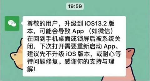 例如微信这样的团队已经意识到了用户的反馈。昨日下午,“微信团队”向部分iOS用户发送消息表示,“升级到iOS 13.2版本,可能会导致App(如微信)在回到手机桌面或锁屏后被系统关闭,下次打开需要重新启动App。建议先不升级iOS版本,或耐心等待问题修复。”