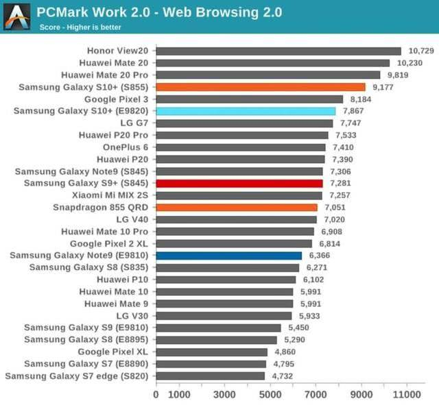 跑分方面,根据androidheadline给出的测试数据,骁龙855的性能优势相比Exynos也更明显。