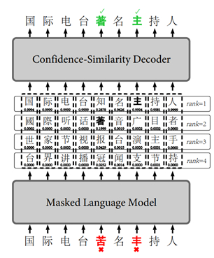 本文提出的模型FASPell中,DAE是由BERT中的掩码语言模型(MLM)来充当,解码器是本文提出的把握度-字符相似度解码器(CSD)来充当,如下如所示: