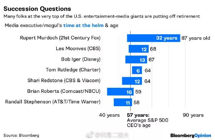 从另一个角度看,面对手握优质内容的传统媒体公司,这三家互联网巨头有机会撕开裂缝吗?或许形势并没有那么悲观 。看看美国这些传统媒体公司CEO的平均年龄(如图),就知道这些媒体行业的老家伙已经落伍了。标准普尔500企业所有CEO平均年龄57岁,目前这些媒体巨头CEO没有一个是低于平均年龄的,最年轻的AT&T CEO Randall Stephenson也年近60。互联网公司的新打法或许会让这些老家户发现,江湖已经不一样了。