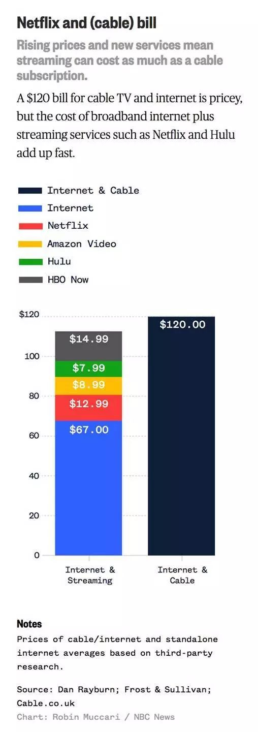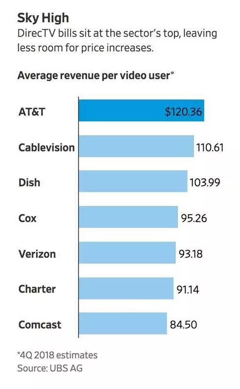 最先一骑独出的是曾经的DVD碟片出租商,后来的互联网巨头Netflix。在Netflix杀入视频媒体行业之前,典型的美国家庭用户会给互联网和有线电视接入商每月贡献120美元的收入。瑞银(UBS)2018年四季度的数据显示,平均每个视频用户给通信运营商如AT&T创造的收入为120美元/月,Verizon为93美元/月;对于Dish这样的卫星电视服务商的价值为103.99美元/月。在手机通讯费用已经落到不足50美元/月的北美通信市场,这样的高价视频服务显然无法维持下去。