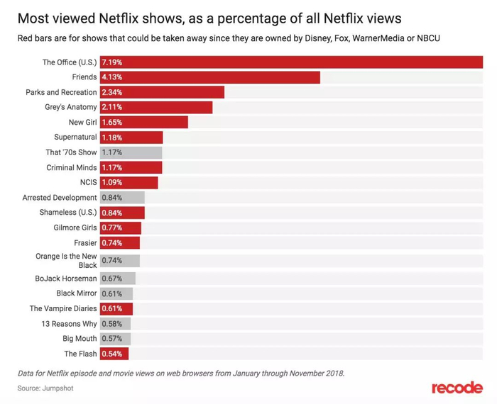 Netflix播出时间占据首位的"The Office"消耗了用户7.2%的观看时间。这部神剧被誉为"美国人的生活背景音",很多美国人一边在家里打扫卫生、做饭、健身,一边开着电视听着耳熟能详的对话。目前Comcast所属的NBC Universal已经确定2021年收回Netflix的授权。也就是说,Netflix即将失去自己的的首席王牌剧集。