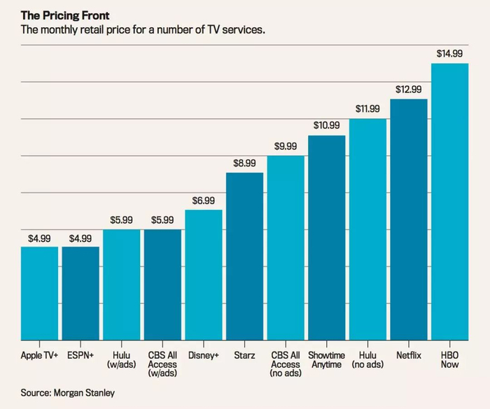 各家的流媒体服务厉兵秣马,蓄势待发。如图是2019年10月份"巴伦周刊"刊登的流媒体价格竞争前线。