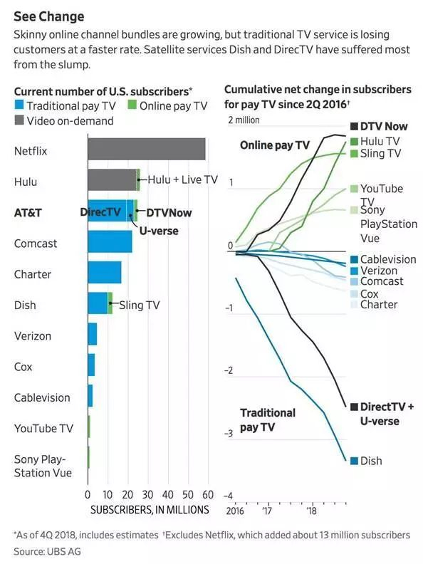 而在线付费电视正在疯狂蚕食传统付费电视的市场。最大的五家传统付费电视服务提供商:Comcast,AT&T/DirectTV,Charter通信,Dish和Verizon,2018年付费订阅数下滑了4.2%,约合320万用户。在线付费电视中增长最快的则是DTV Now,Hulu TV和Sling TV。