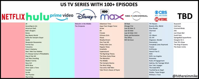 超过100集的美剧 -- Hulu,CBS All Access,HBO Max,NBCU