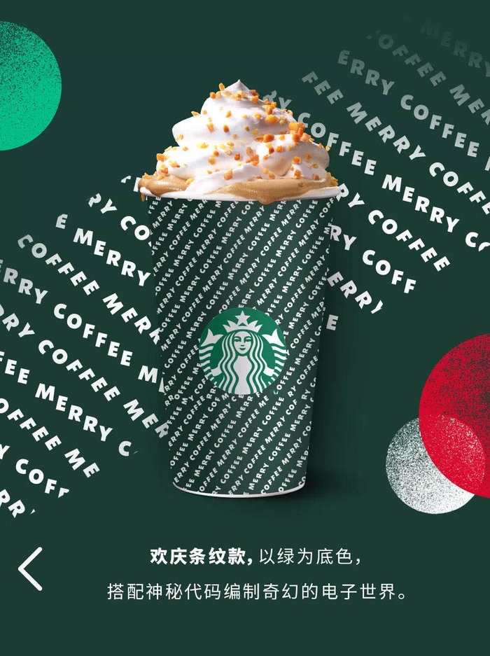 另外两款看起来则更前卫些——一款在圣诞绿的底色上加入了密密排列的英文字母,另一款则排列着“Merry Coffee(咖啡快乐)”的 双层字母错位,字母同样是红绿为主色调的。