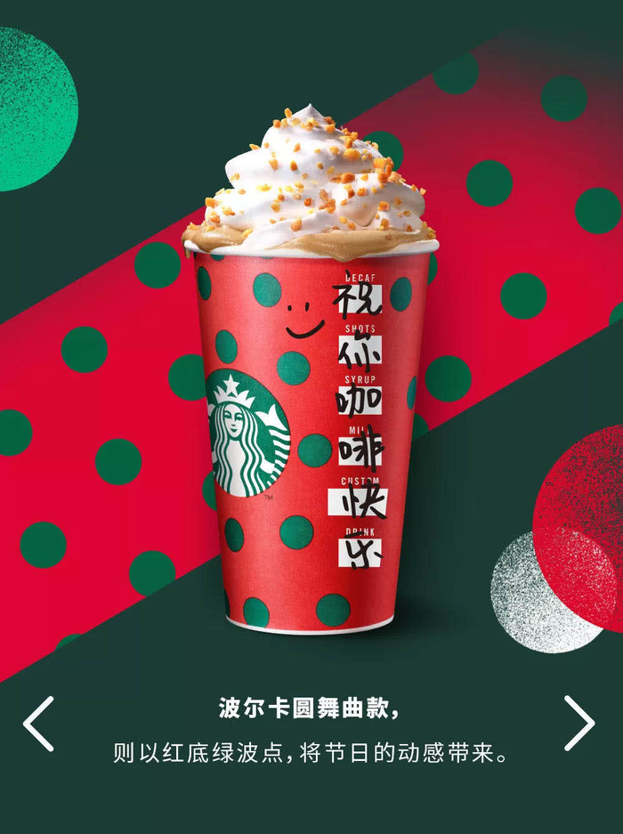 11月5日,星巴克正式在中国市场发布了2019年的圣诞纸杯。今年的圣诞纸杯共有四款,除了人们习惯的圣诞红杯,还有墨绿和白色设计。其中两款为经典的圣诞红绿撞色——比如红绿波点的搭配。