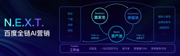 N.E.X.T.百度全链AI营销,重新定义了百度在消费者运营时代的营销路径,AI和大数据技术在消费者需求激发池、品牌资产池、营销体验池三大营销环节的全面打通,利用商业工作台(Toolkits)为客户和合作伙伴赋能每一个链路,打通消费者营销决策闭环,实现共振式的协同营销能力,用商一体全面满足品牌营销的各项诉求。