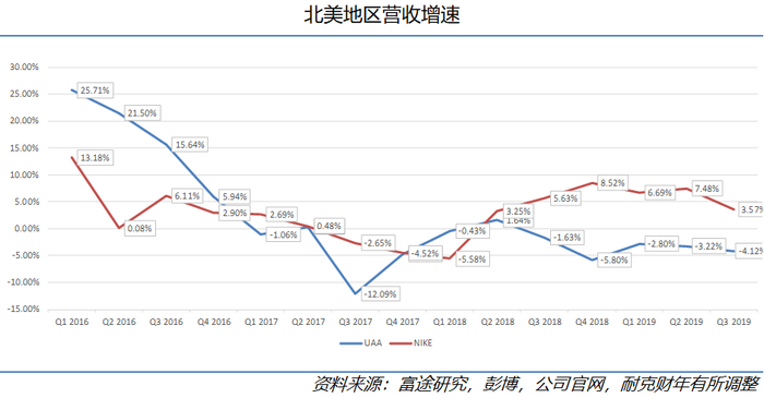 然而北美地区的表现实在是一言难尽,自2016年以来,北美地区营收开始一路下滑,2016年第一季度的增速还有25.71%,到2017年就开始负增长了,实在让人好奇北美地区运动鞋服市场发生了什么?对比耐克北美地区的增速同样可以发现,2016-2017年确实经历了低迷期,到2018年才开始有增长趋势,不过由于耐克北美业务营收占比还不到50%,对整体营收影响并没有安德玛大。