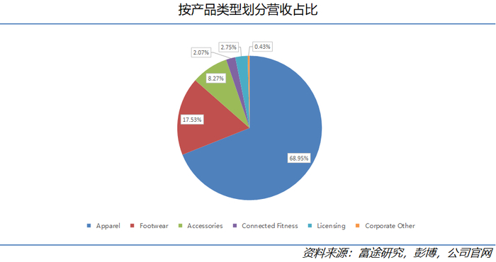 按产品类型来看,服饰(Apparel)依旧是第一大营收来源,本期服饰占比达68.95%,较去年略有增长0.70%到9.86亿,虽然近年来安德玛一直有发展其他业务,如鞋类及其他运动配饰类,但是从营收占比来看,运动服饰占比依旧很高,长期占比高达60%以上。