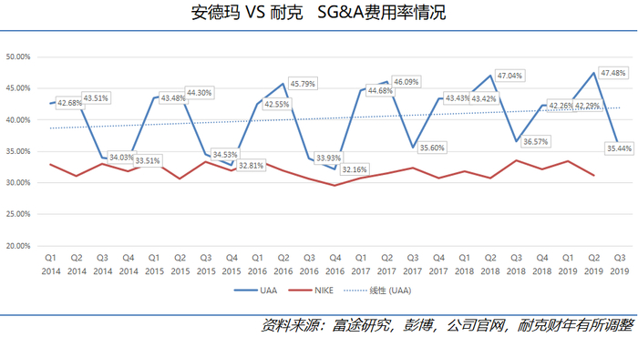 尽管营收增速一路放缓,安德玛在成本管控上却没有非常严格,尤其是近年来,在SG&A费用率(包括销售成本及管理成本等所占营收比)上,数据却稳步上升,到本期,SG&A的费用率已经达到41.89%,远高于耐克的费用率水平。