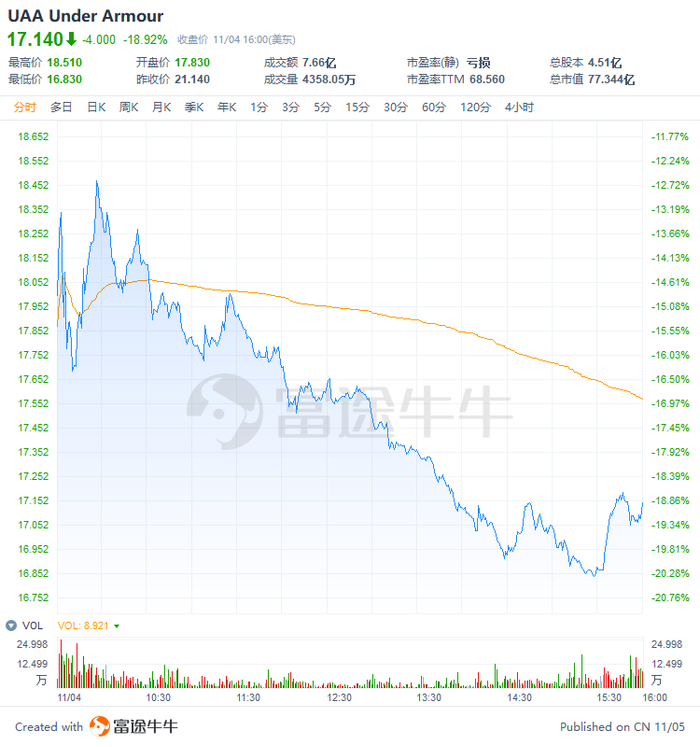 美东时间11月4日盘前,安德玛公布了2019第三季度财报。而就在前一天,安德玛被爆出因为会计舞弊,正在接受司法部及SEC调查。由于会计舞弊影响较大,加上财报表现也并不出彩,安德玛股价一路下滑,最后收跌18.92%。