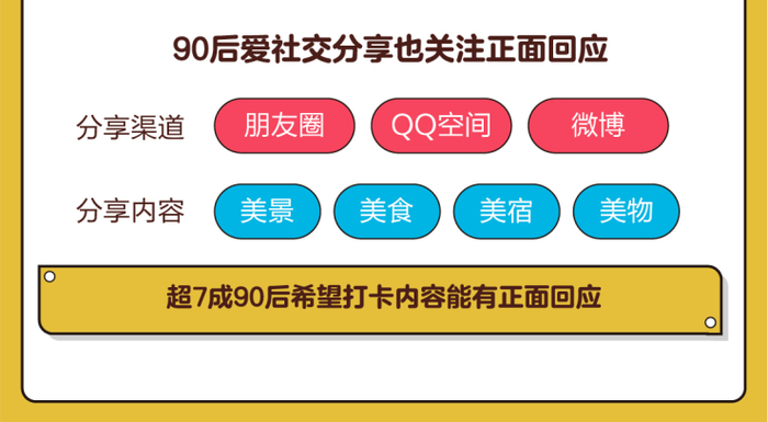 热衷于社交活动的90后,非常愿意在社交平台分享旅游中看到的美景、吃到的美食、买到的美物等,朋友圈、QQ空间、微博是他们分享的主要阵地,同时他们十分在意获得的点赞、评论的数量和质量。超过7成的90后表示希望别人对自己的打卡内容做出正面回应。