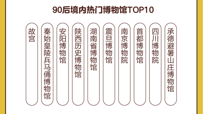 出游主题方面,去感兴趣的地方进行文化溯源式深度游最受90后追捧,尤其境内众多传统文化景点尝试新潮玩法,让历史与文化变得更加鲜活生动,吸引了大批90后前往。途牛大数据显示,过去一年,故宫、秦始皇陵兵马俑博物馆、安阳博物馆、陕西历史博物馆、湖南省博物馆、震旦博物馆、南京博物院、首都博物馆、四川博物院、承德避暑山庄博物馆等位居“境内博物馆热度榜单”前十名。