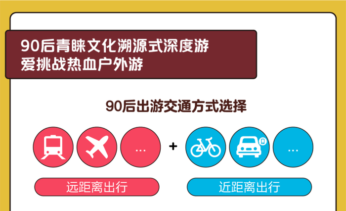 在交通方式上,90后出游更依赖公共交通,在利用高铁、飞机等解决远距离出行需求的同时,也喜欢结合网约车、共享单车解决短距离出行需求。