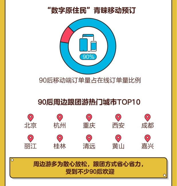 在出游方式选择方面,尽管跟团方式每天都要赶早集合出发,让患有“晚睡强迫症”的90后很无奈,但是,凭借省心省力且行程规划日益合理等特点,也受到部分年轻人的欢迎,尤其是进行周边游时。过去一年,周边跟团热门目的地TOP10包括北京、杭州、重庆、西安、成都、丽江、桂林、清远、黄山、嘉兴。