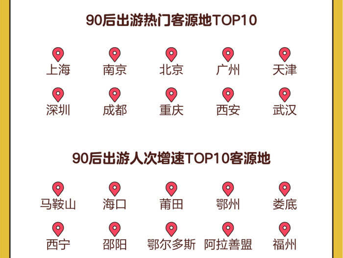 整体而言,途牛大数据显示,过去一年,热衷旅游的90后主要来自上海、南京、北京、广州、天津、深圳、成都、重庆、西安、武汉等一线及新一线城市(城市分级依据第一财经•新一线城市研究所《2019城市商业魅力排行榜》)。伴随着国家经济的发展,过去一年,马鞍山、海口、莆田、鄂州、娄底、西宁、邵阳、鄂尔多斯、阿拉善盟、福州等城市90后游客人次增速较快,除海口、福州为二线城市外,其他城市属于三四五线级。