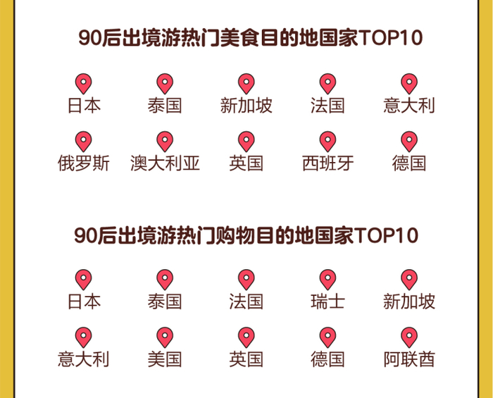 90后“吃货”本色在境外也表现得淋漓尽致。途牛大数据显示,过去一年,日本、泰国、新加坡、法国、意大利、俄罗斯、澳大利亚、英国、西班牙、德国等目的地国家的美食让90后游客念念不忘。