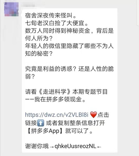 伴随着微信独特的音效,肖钰点开手机,桌面上躺着一条来自好友的微信,开头如上文。肖钰不解,正要发信息询问好友,点进对话后,才发现这是一大段文字,核心内容是“点击链接或者复制整条信息打开【拼多多App】就可以了!”